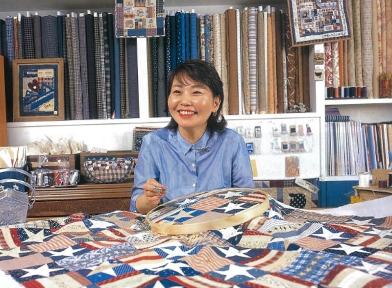 【プロフィール】高校時代から独学でキルトを始める。短大卒業後、五年間会社勤めを経験。結婚退職し、夫の転勤で2年間札幌で過ごす。この間に大滝学園で1年間キルトを習い、猛烈に制作する。帰京してからパッチワーク通信社のインストラクターコースを1年間受講。1987年ショップ&工房「クリブキルト」を設立。2002年ドイツのキルトショーに日本人で初めて講師として招かれる。