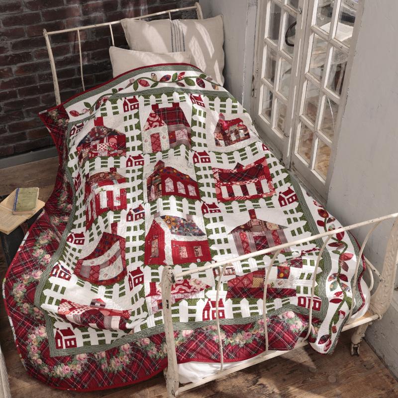 キルトジャパン10月号14ページ掲載の、赤いハウスに白い柵をイメージしたラティスを組み合わせたタペストリー。