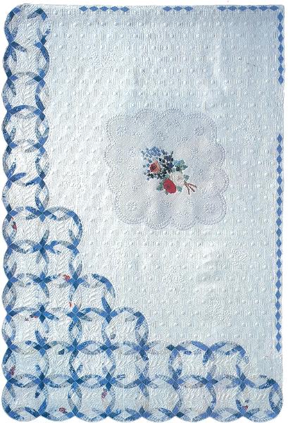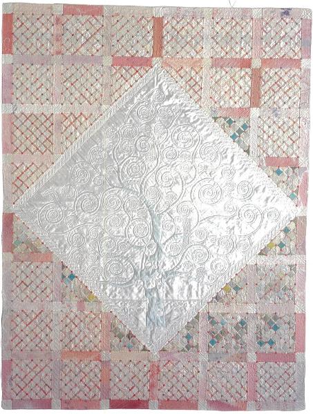 一般のウェディングリングより分割をシンプルにして、たった4枚のピースのパターンにデザイン。中央のトラプントのは朱赤の毛糸を入れて、セピアのレースの上に置いたばらの花束を表現。“よりシンプルで、個性的な美しさを持つ”の基本的な考え方が明快なキルト。