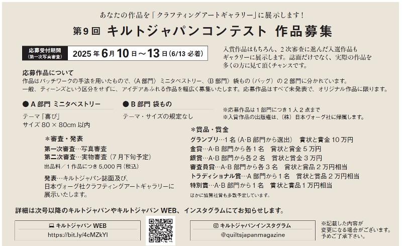 パッチワークキルトの技法を用いたものであれば、タペストリーでもバッグでも構いません。キルトジャパンであなたの自信の一作を発表しませんか?
