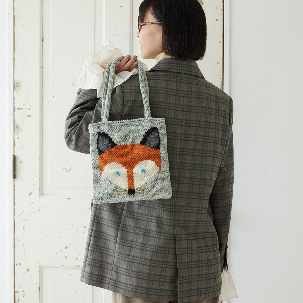 動画を視聴しながら学べます縦に糸を渡す方法で編み込んだキツネのミニバッグ。