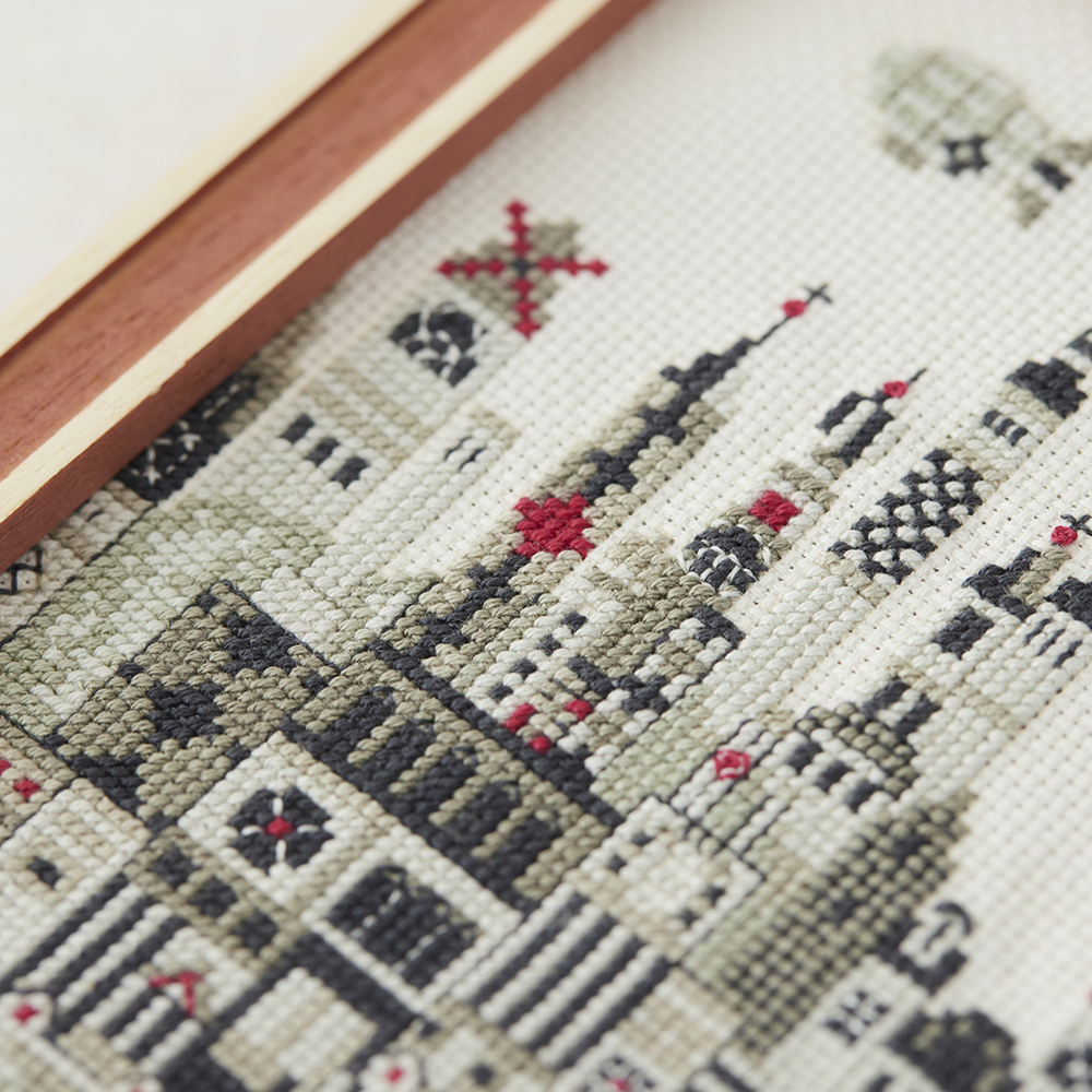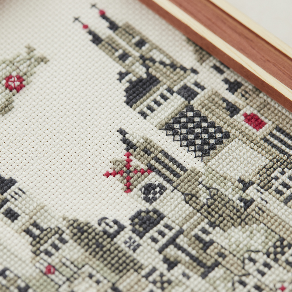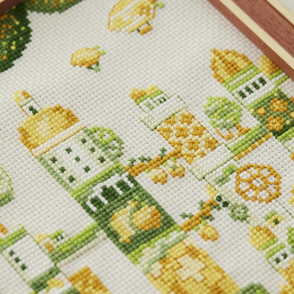 空想街雑貨店の水彩画を表現するため、目の細かい18カウントの布地に25番刺しゅう糸を2本どりで刺し、細部にわたり色を変えた魅力的なクロスステッチです。