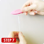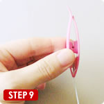 7長い方の糸を引いて、結び目をシャトルの芯までしめます。