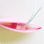 1シャトルのとがった部分を左手で持ち、糸を通します。