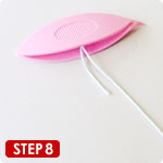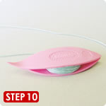 9シャトルの先を上にし、とがった部分が左側に来るように、シャトルを持ちます。次に、手前から向こう側へ糸を巻きます。短い糸端は一緒に巻き込んでください。