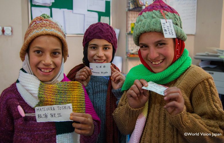 この厳しい状況にかんがみ、2017年度の「世界の子どもへ手編み作品を贈ろう」プロジェクトは、アフガニスタンの子どもたちを支援先として実施いたしました。日本の皆さまにお寄せいただいた、1,359枚の手編みのセーター、28枚のベスト、1,911枚の帽子、1,968枚のマフラー、2組の手袋、4足の靴下計5,272点の編み物作品を、2017年12月下旬にアフガニスタンのヘラート市で、ワールド・ビジョン・アフガニスタンが運営するストリート・チルドレン・センターに届けました。