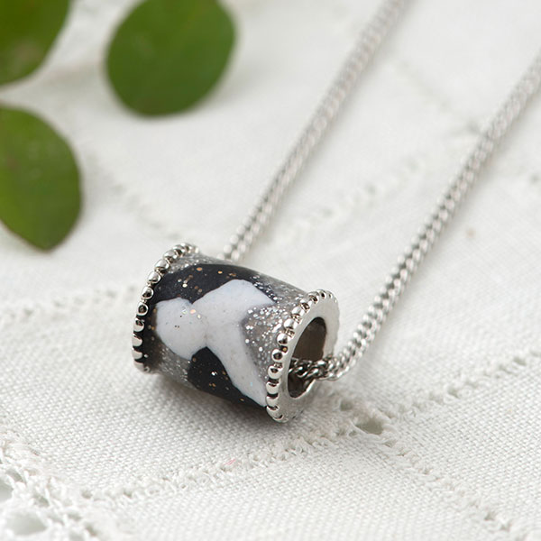 ホワイト、ブラック、シルバーのクレイをランダムに組み合わせた、 シャープな印象のネックレスです。