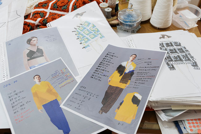 決して詳細とは言えないデザイン画を編み図に置き換え、糸の太さやイメージをデザイナー以上に知らねばならない…。もしかしたら自分でデザインするより難しいことかもしれません。だからこそ形になった時に何ものにも代えがたい達成感が生まれるのです。