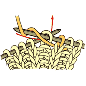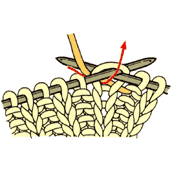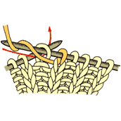 3記号図の反対の編み目(裏目)で編みます。糸を手前に置き、端の目に矢印のように針を入れます。