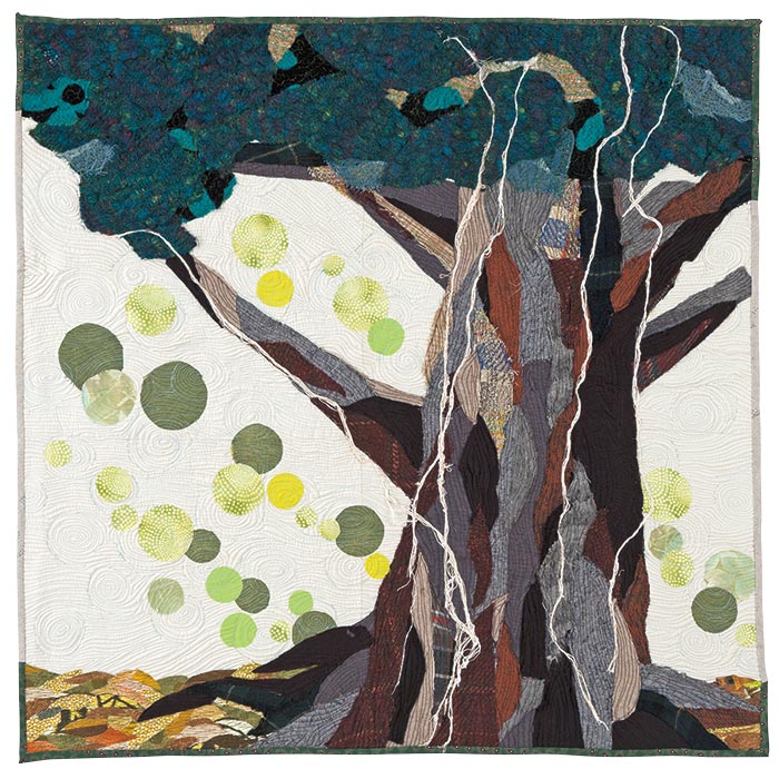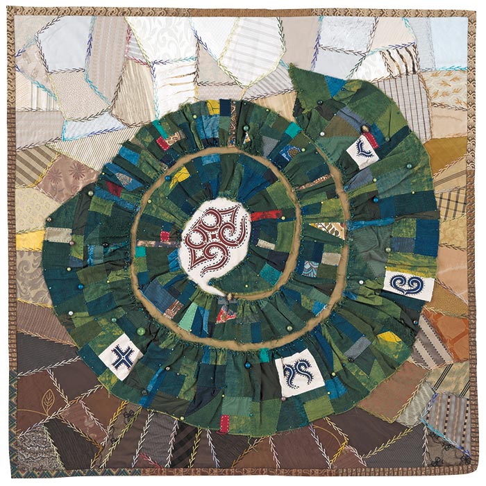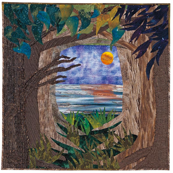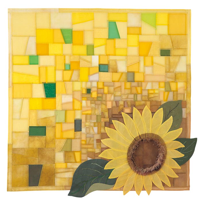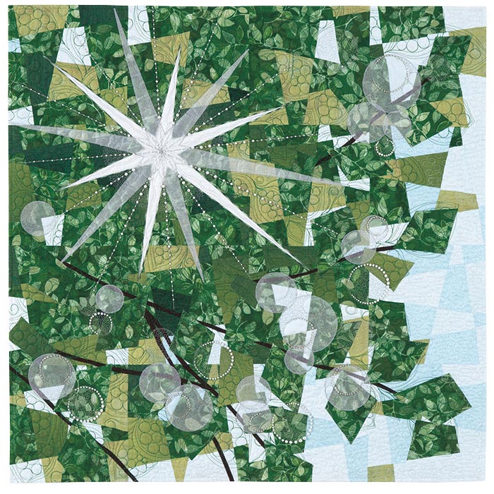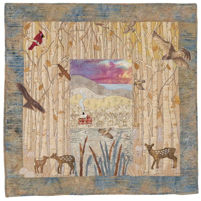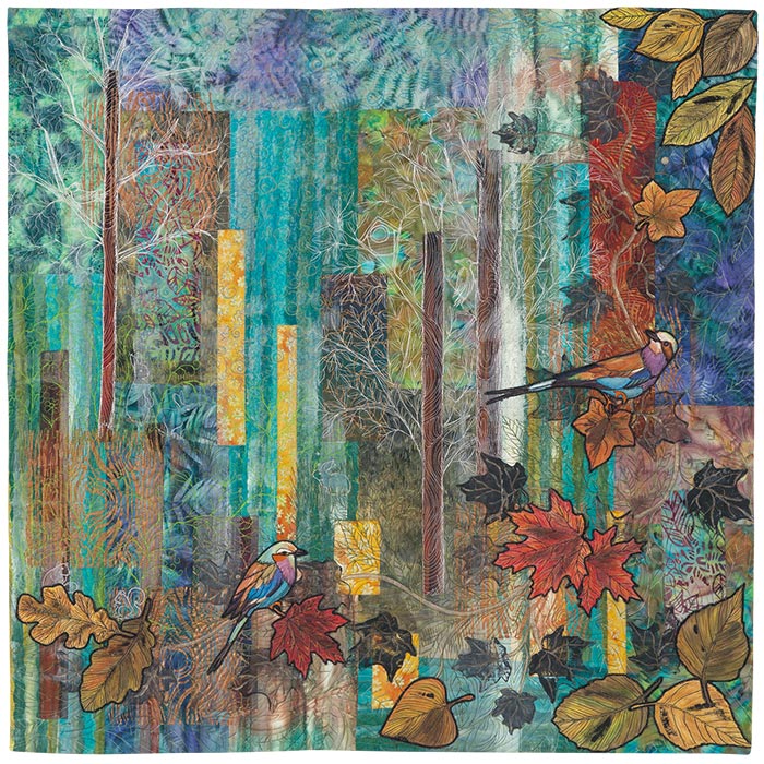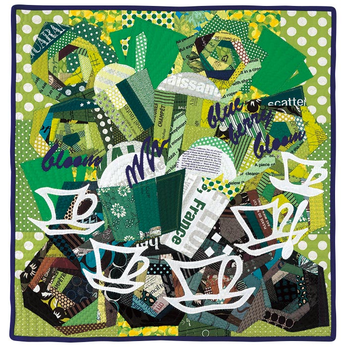 - ウォーキングの途中に森の横を通ります。鳥の声、虫の声、風にゆれる葉の音、自然の音や香りを感じられるキルトを表現してみました。