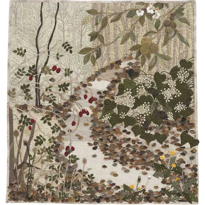 小関鈴子:小さな丸いアップリケが細かく丁寧に仕上げてあります。赤い実や白い実がアクセントになっていて自然の中に咲く花々の強さ、楚々とした美しさを感じます。
