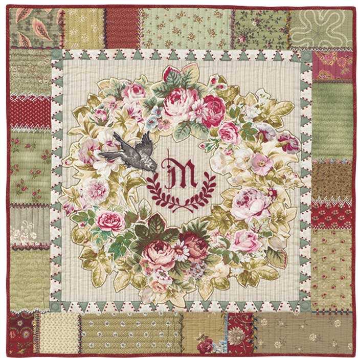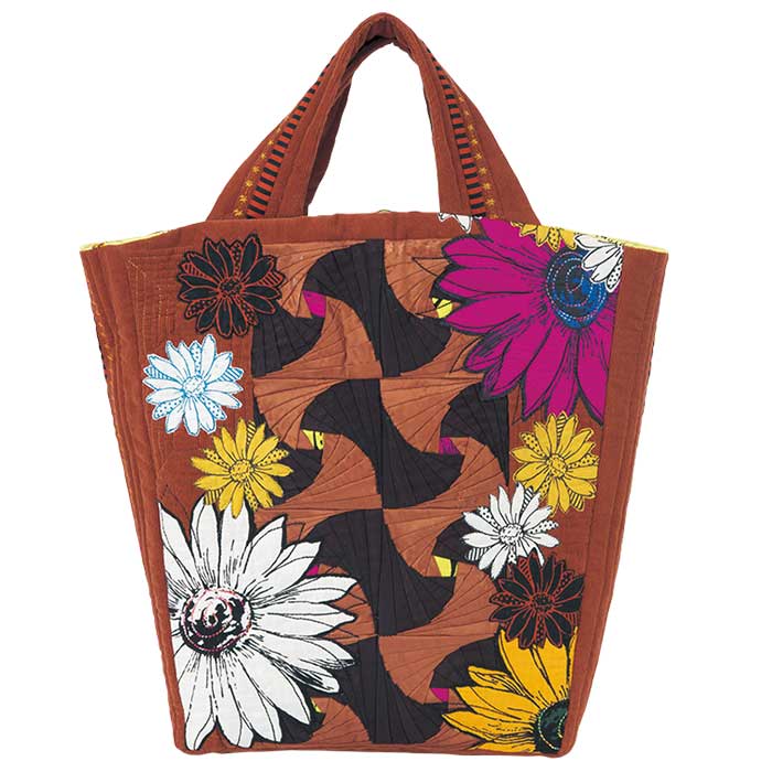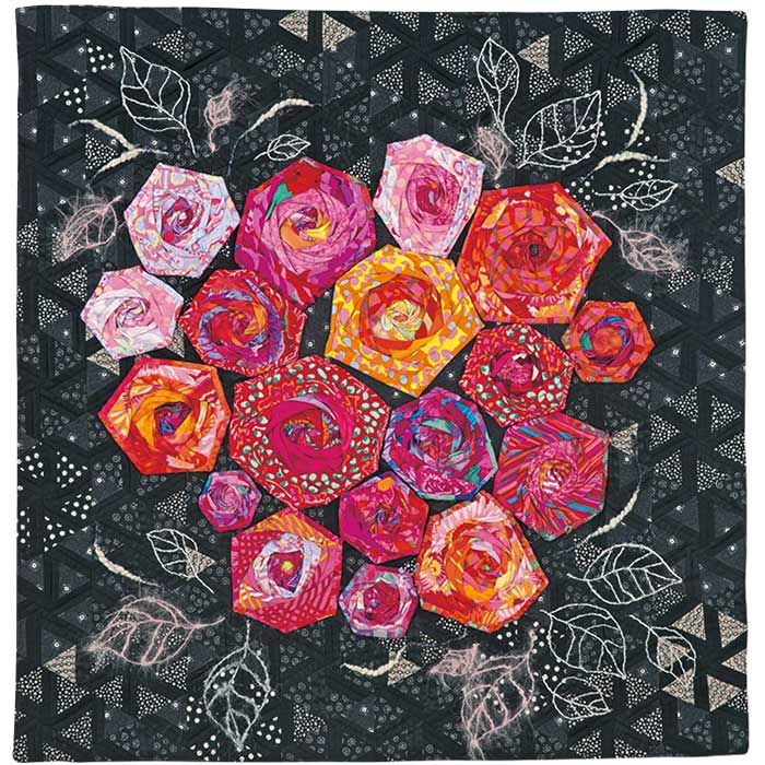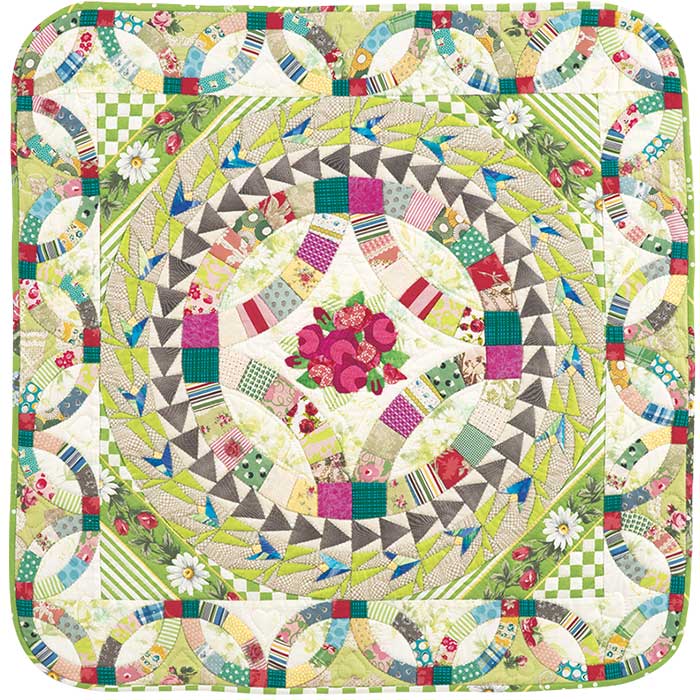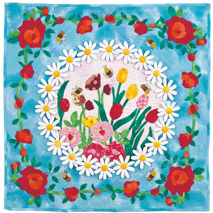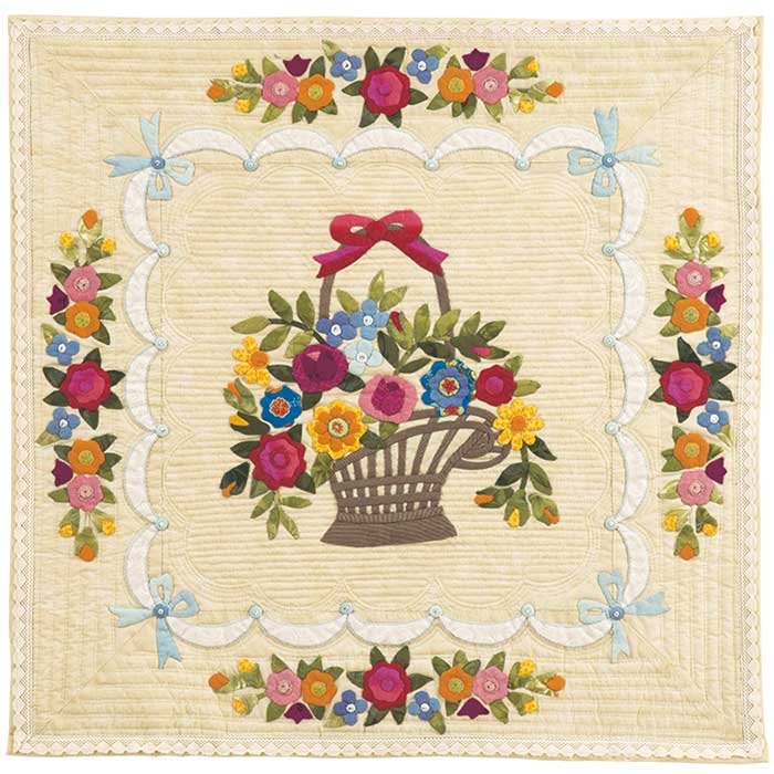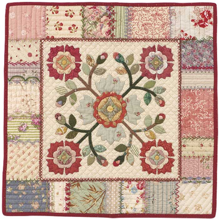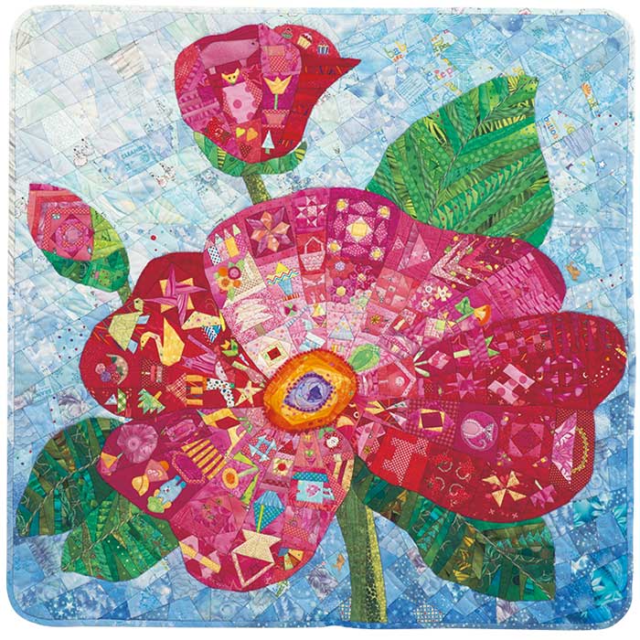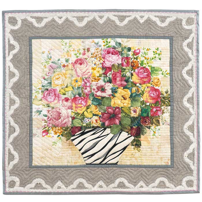 編集部:花びらの中に入れ込んだいろいろなパターンのピースワークがとても楽しい作品です。大胆に配置した花のデザインも素敵です。