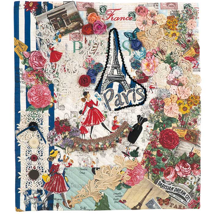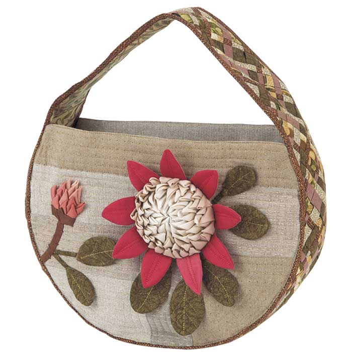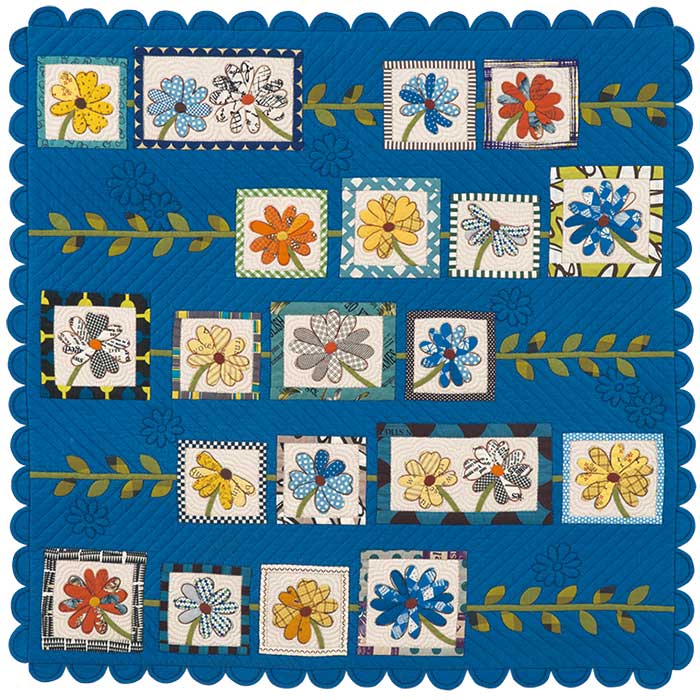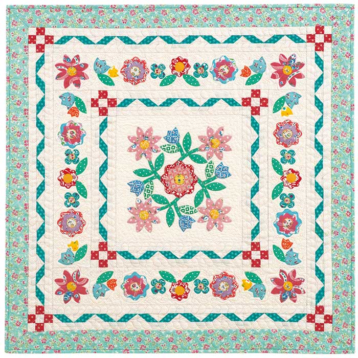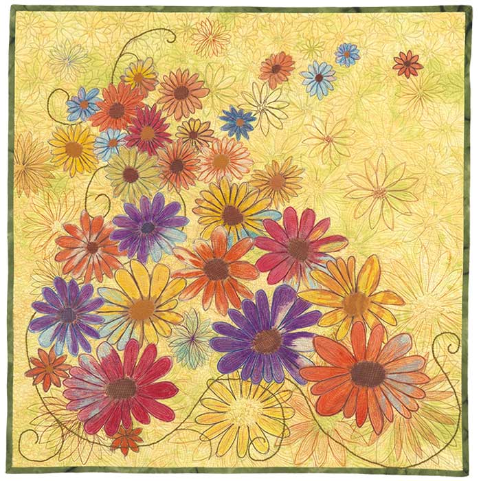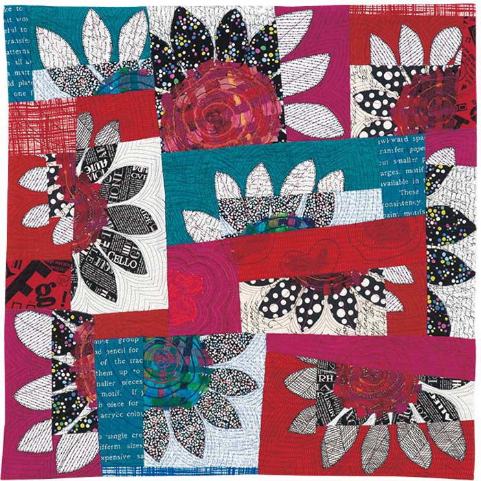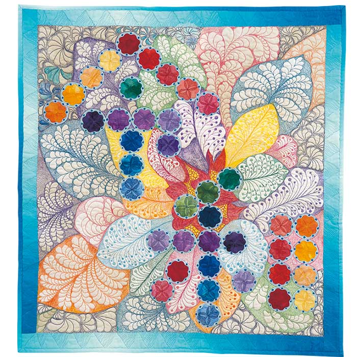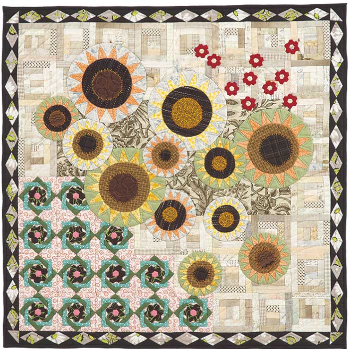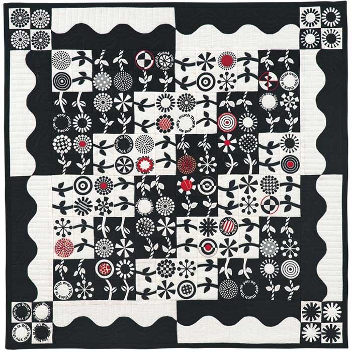 編集部:花びらの中に入れ込んだいろいろなパターンのピースワークがとても楽しい作品です。大胆に配置した花のデザインも素敵です。