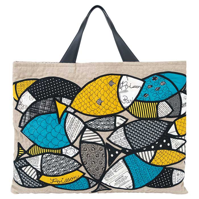 - 水族館の水槽を回遊する魚をイメージしました。大好きな麻を土台に使ったパッチワーク用の丈夫なレッスンバッグです。
