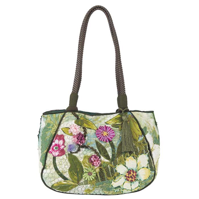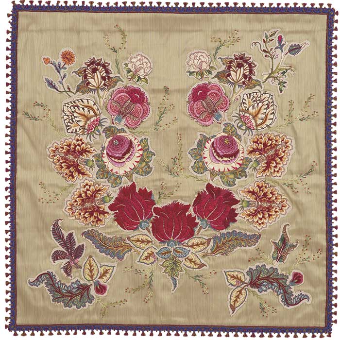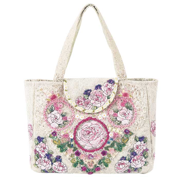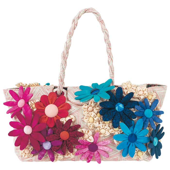 - 大好きな花を思いきり自由にデザインしました。色も形も現実を離れて美しく楽しいことを思い描き、リボン刺しゅうなどでアクセントをつけました。