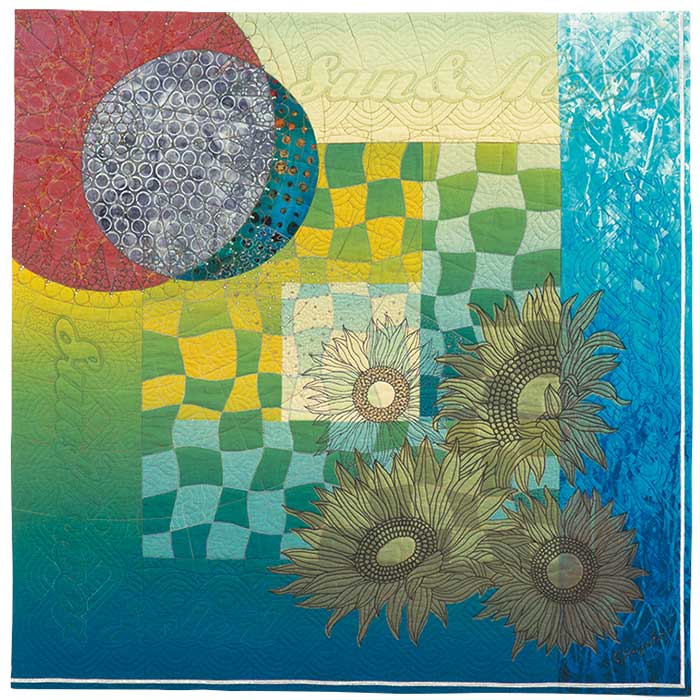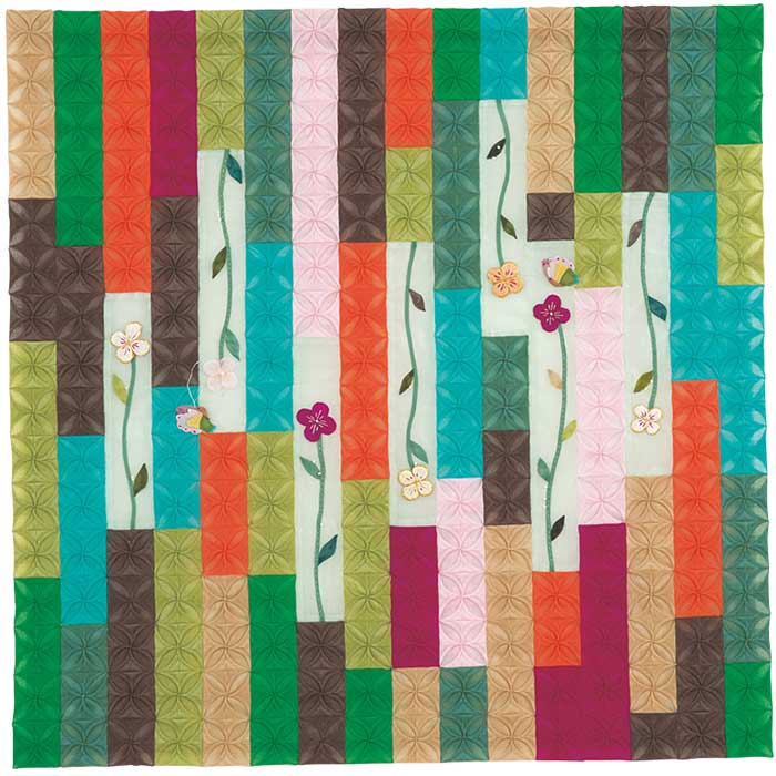 - オレンジ色、黄色、黄緑色などのビタミンカラーを使い、キルトを見た人が元気いっぱいになるような作品にしました。