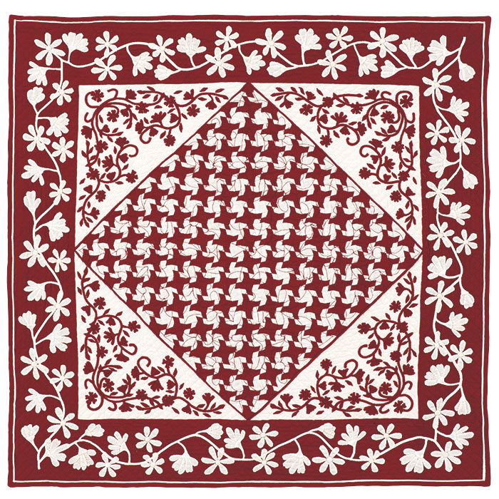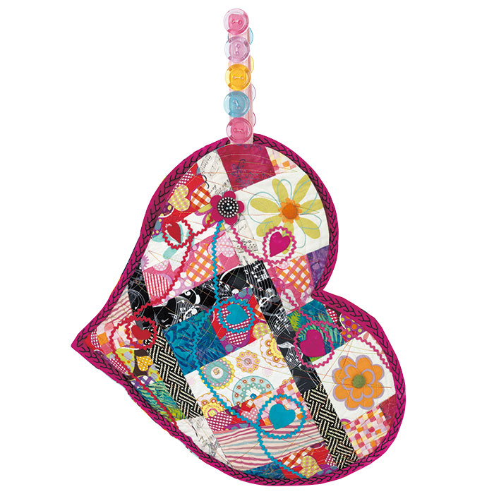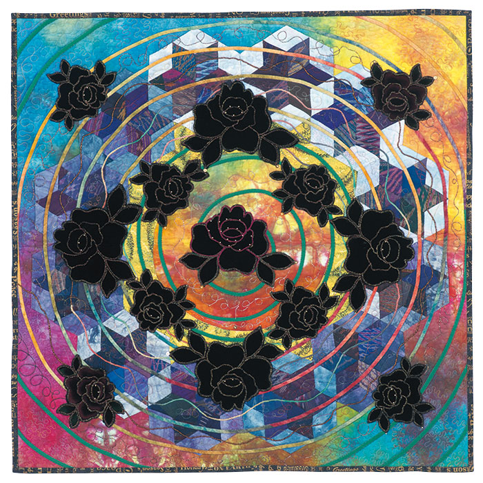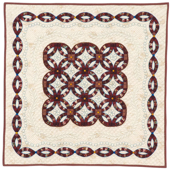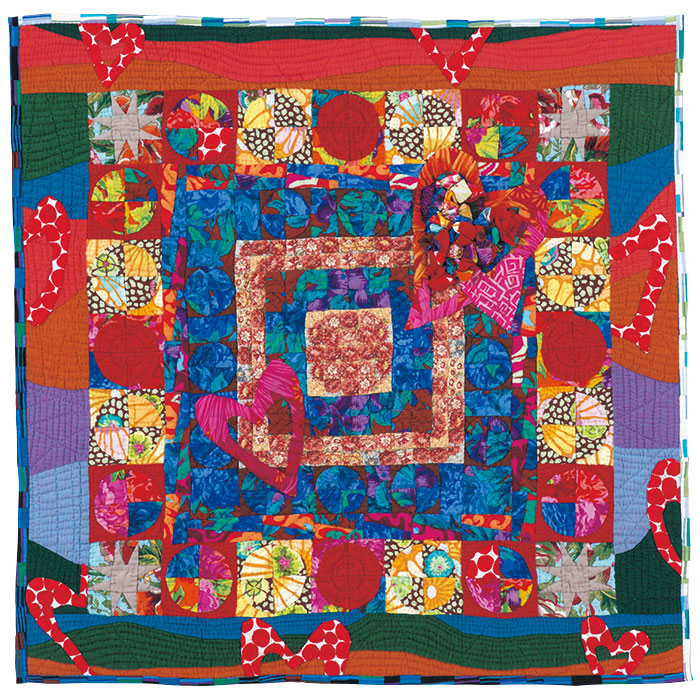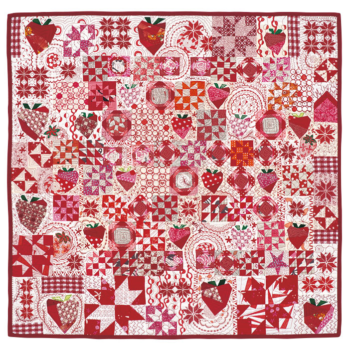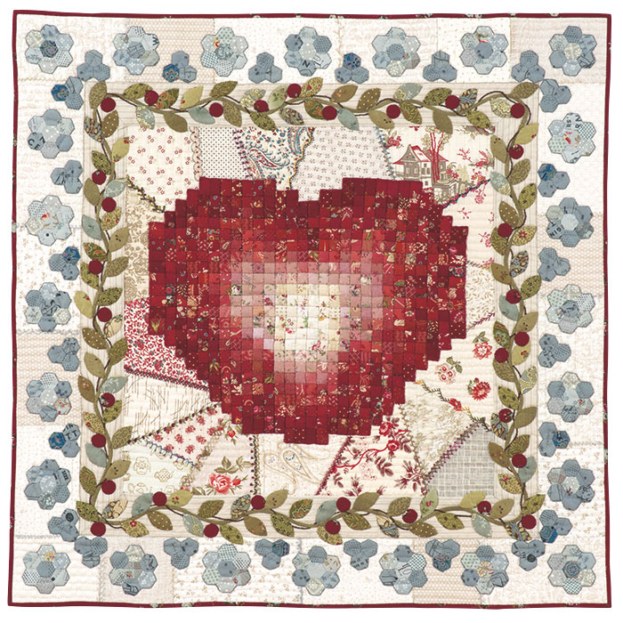 構図のバランスがよく、トラディショナルキルトの様々な要素が一つの作品にまとまっています。モザイクのようなグラデーションのハートはインパクトがあり、刺しゅうやアップリケなど細部まで丁寧に作られています。