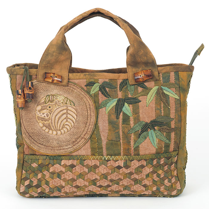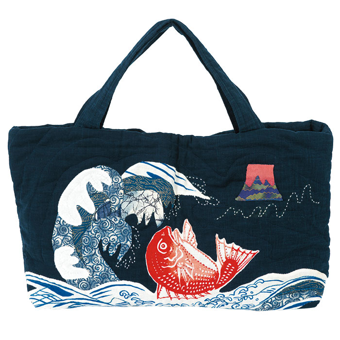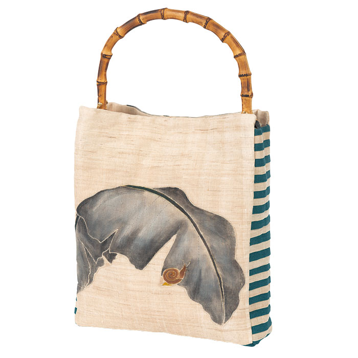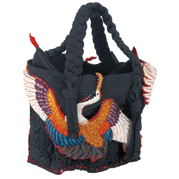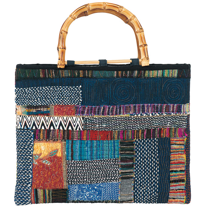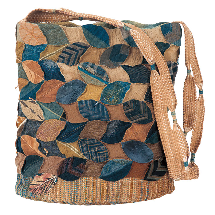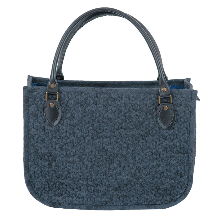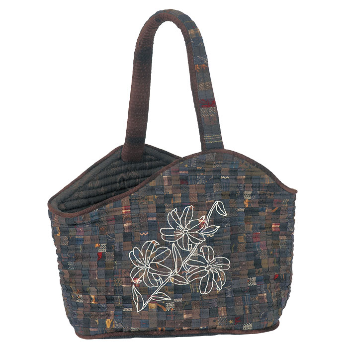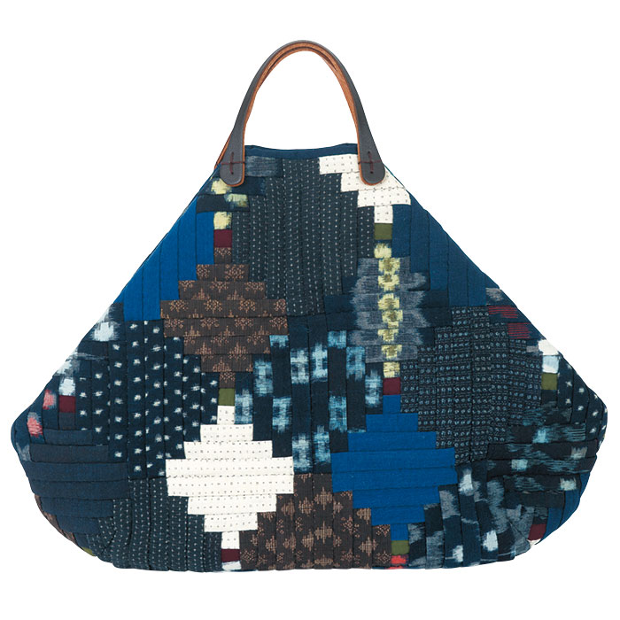 大事にしていた古布を使い、刺し子の図案を立体的にデザイン。裏布素材を工夫し重くならないよう仕立てました。まち・底・持ち手はさき織りです。