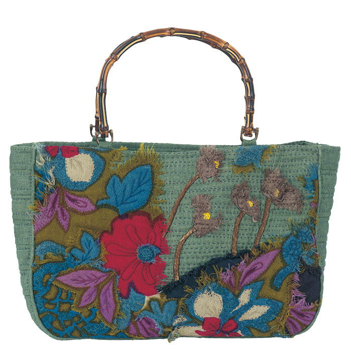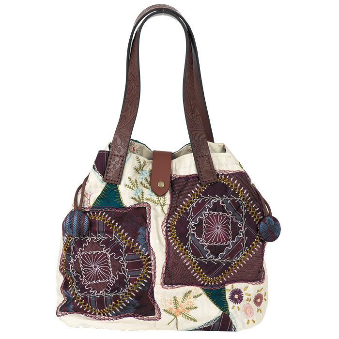 こうの早苗:土台布と花モチーフのバランスが優れています。布端がところどころほつれているのもおしゃれです。