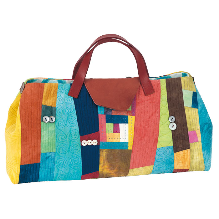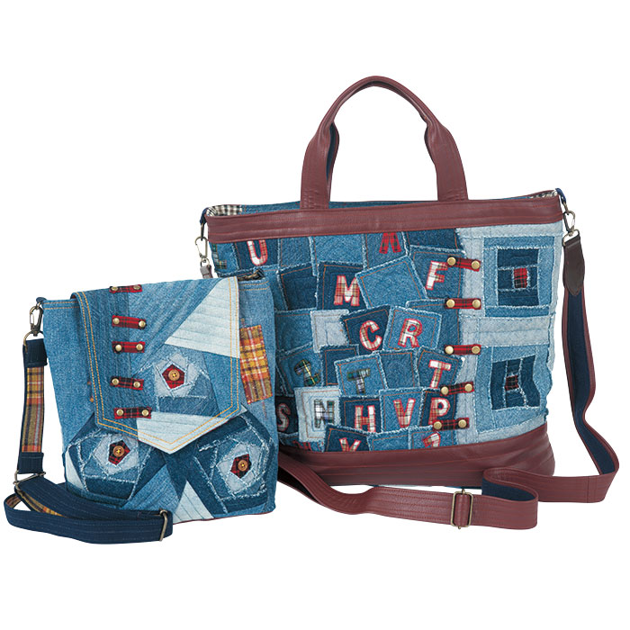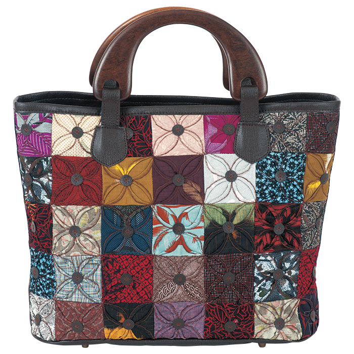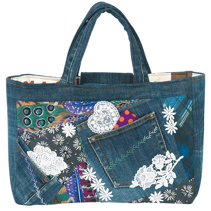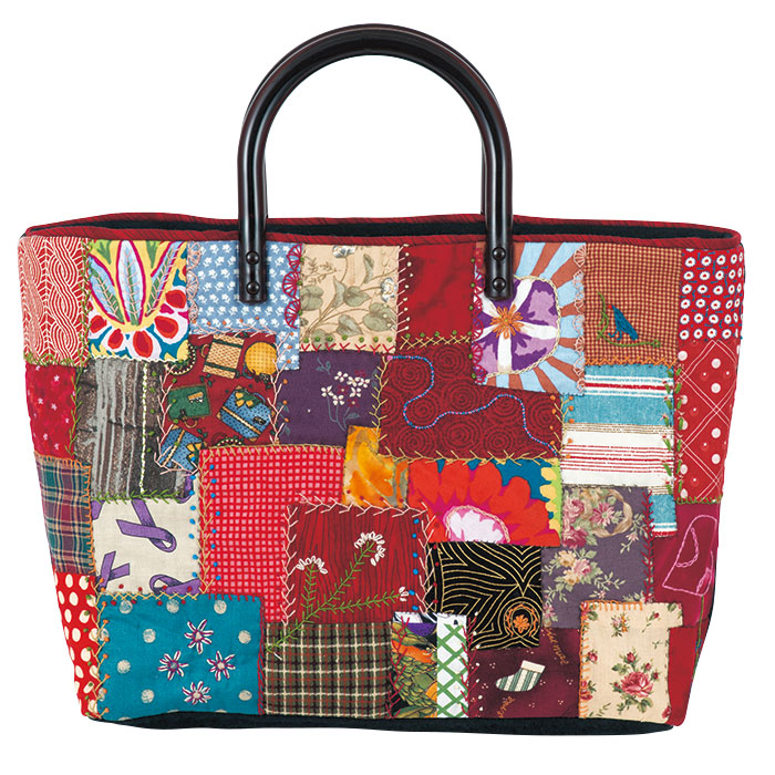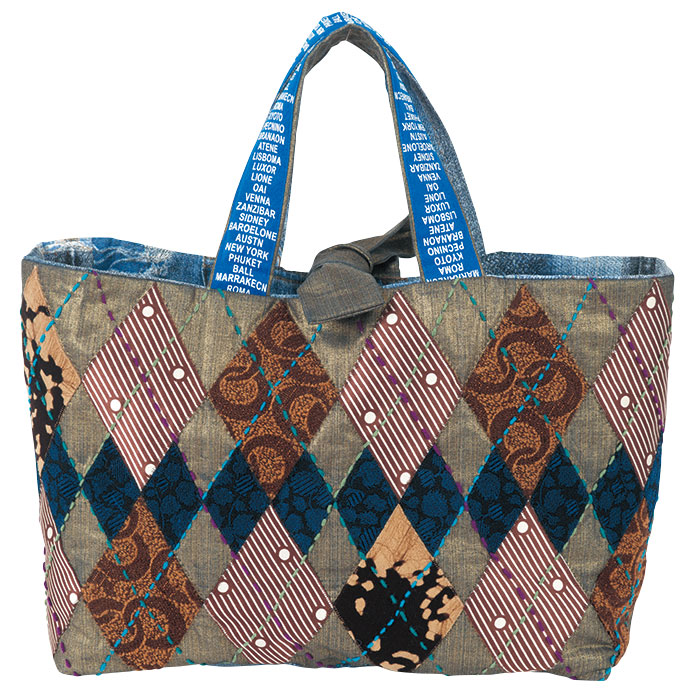 捨てることのできなかった小さな端切れをつなぎ、しっかりとミシンキルトをして、デニムの端布と合わせてバッグにしました。