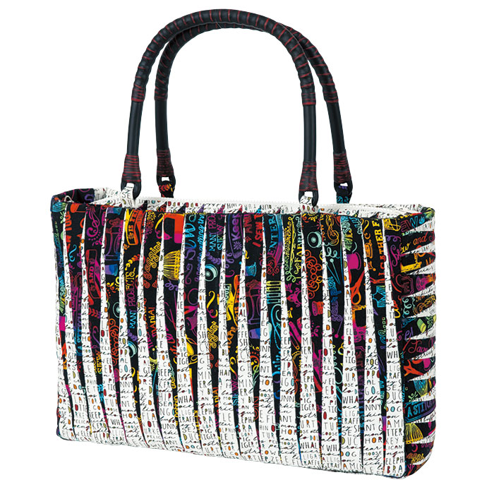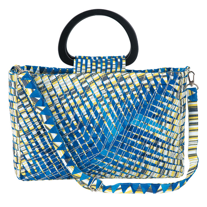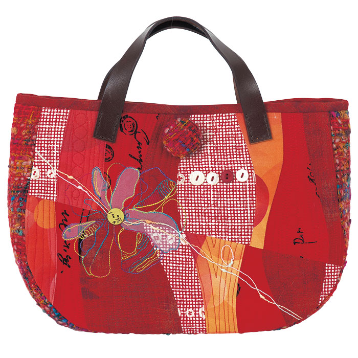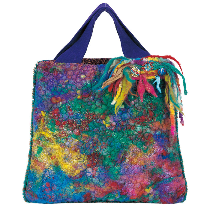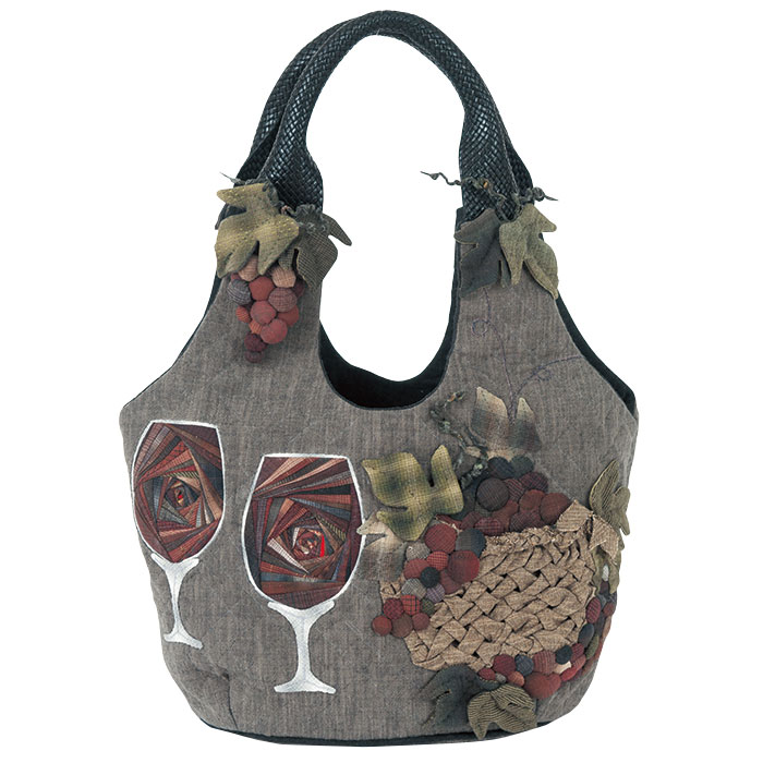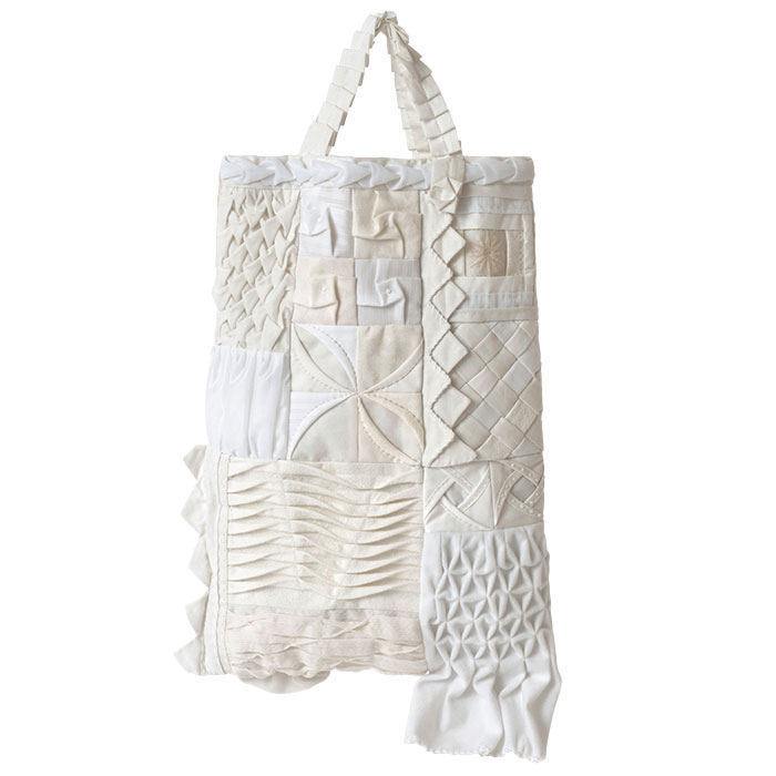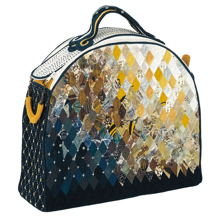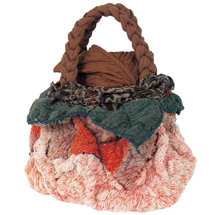 まるでオブジェのような、人々を驚かせるデザインで、作品を見て会話がはずみます。スラッシュキルトをかごのように変化させ、葉っぱをイメージしたふたもデザインに合っています。