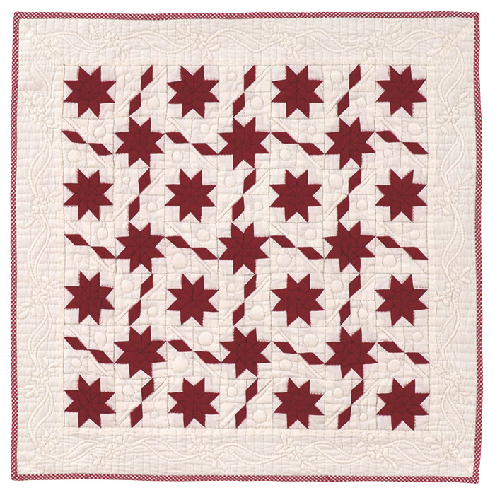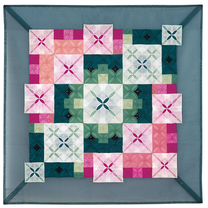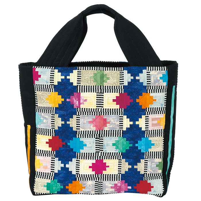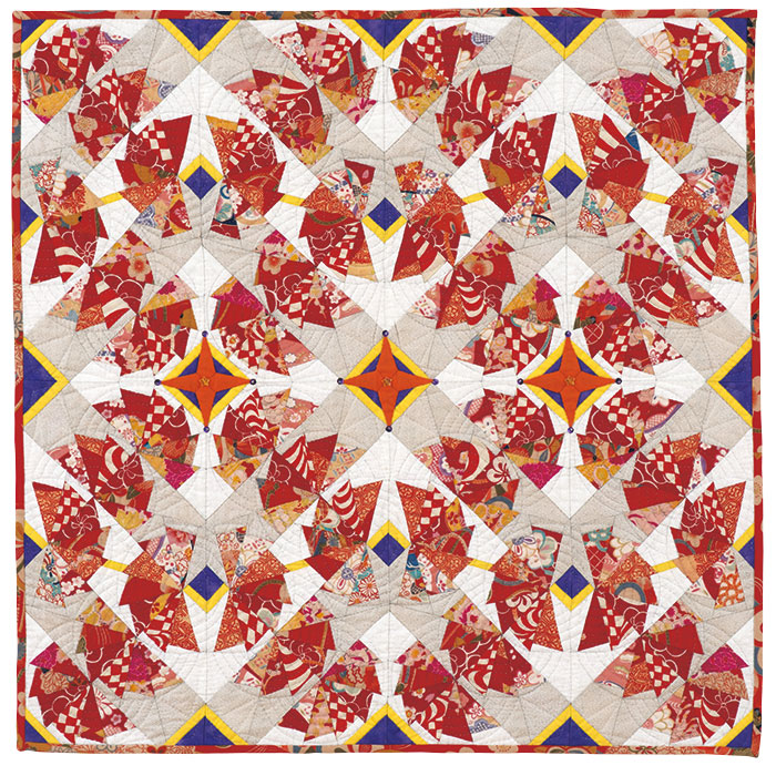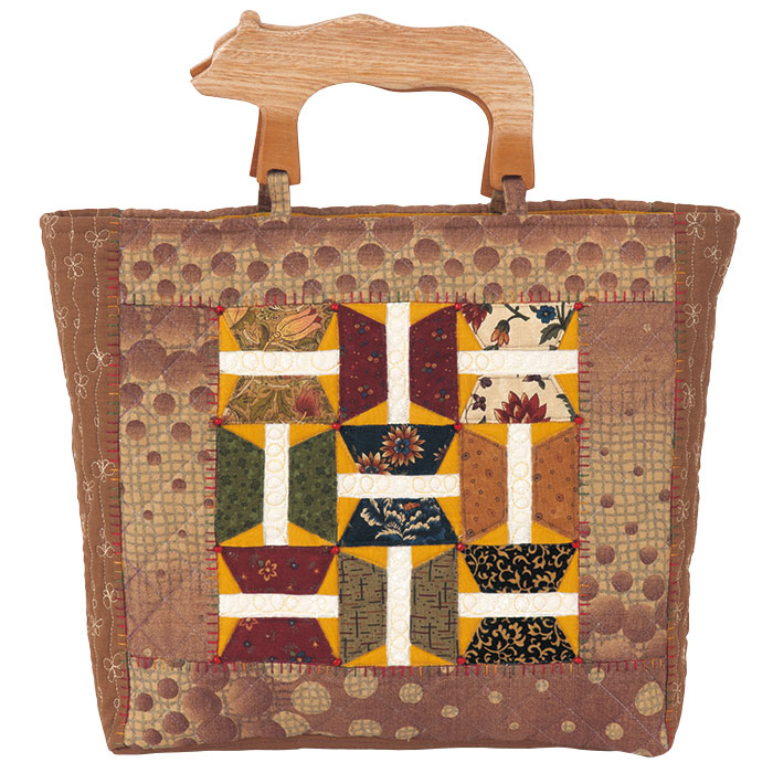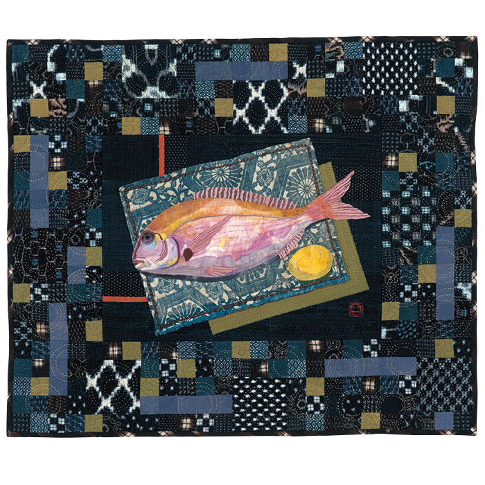 藤田久美子:近感のバランスが素晴らしいです。三角形の木の直線の使い方や銘仙などの布の使い方も上手で、パッチワークの楽しさが伝わります。