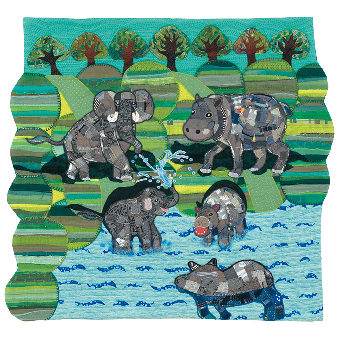 ハギレから生まれたカバと象が水遊びを楽しんでいます。動物や豊かな自然が守られるように願いを込めて作りました。