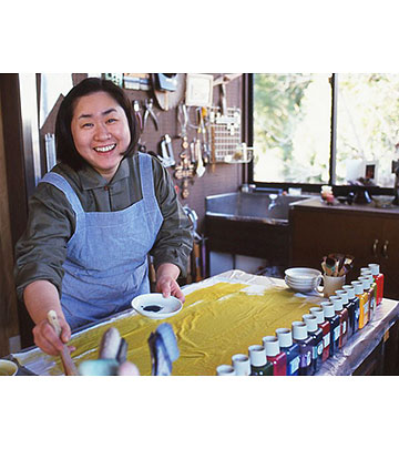 小さい頃から人と同じでは嫌な子だった。そんなこだわりが染めやミシン織りの素材となって、上田さんのキルトに欠かせない要素となっている。テーマは、尽きせぬ驚きを与えてくれる自然から得ることが多い。染めもミシンかけも手縫いも、作品を作っている時は無心だ。大好きな布の手触りに幸せを感じながら、「空っぽになっている頭は、きっと脳内麻薬がいっぱいのはず」と言う。キルト界の次世代を担う若手のホープだが、自分の頭を通して、クリエイティブな表現としてのキルトを追求したいという上田さんを、相模原の自宅兼アトリエに訪ねた。