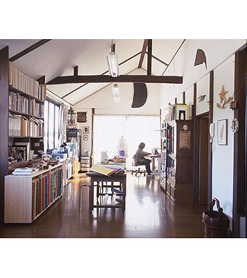 3階のアトリエは上田さんとご主人の共有スペース。自由自在にレイアウトが変えられるように、机や棚ほとんどにキャスターがついていて、あっという間に広い作業スペースができる。家にいる時はなんとなくアトリエで働いてしまうので、旅行に出てリフレッシュするのだとか。