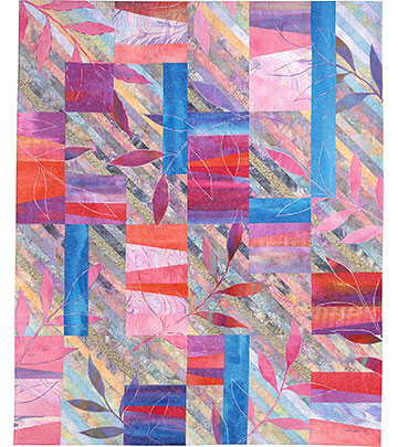 葉(leaves)をモチーフにしたシリーズのひとつ。キルトを通してさまざまな出合いから生まれる喜び、そんな幸福感を色で表してみたら……?という深層心理を、布に反射させてみた作品。手描染め布、マーブル布、バリ島のスタンプバティック布を使用。ミシンピーシング、ミシンアップリケ、ミシンキルティングのテクニックで制作。