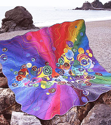 デザインができて10年以上、いろんな布で何度も試し縫いをしたものが、ある時、ベースのグラデーションの布に出合ったことで一気に仕上がった作品である。古いデザインと新しい布、長い年月を経てできた細いラインのテクニックがマッチして力強い作品となった。(桂浜で撮影)