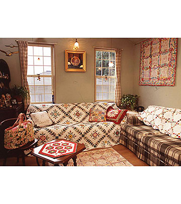 自宅2階のリビングルームにはふだん使いのキルトがいっぱい。