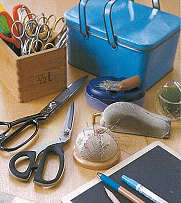 自宅でよく使う裁縫道具一式。アンティークの青い缶は大切な裁縫箱。はさみは20年前のものから最近のものまでいろいろだ。