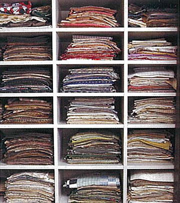 仕事部屋に備えつけた生地棚。色別に分かりやすく収納されている。