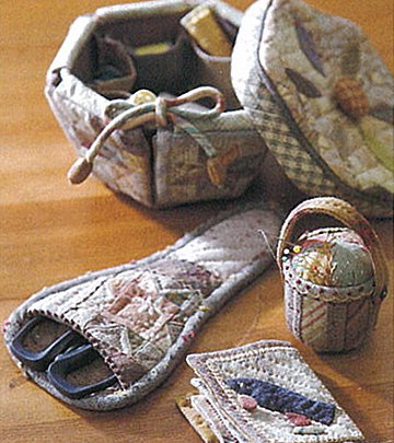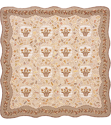 2006年の「キルトウィーク横浜」に出品した作品。シンプルなフラワーバスケットの周りにはいろいろな形のピースをアップリケし、その上には大好きな段染めの刺しゅう糸で表情豊かなステッチが施されている。ボーダーは中央部分よりシックな色合いでやわらかなフラワーバスケットを引き立てて。