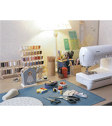 作業机の上には、岡本さんがいつも愛用のミシン、はさみ、糸、定規などが使いやすく並べられている。