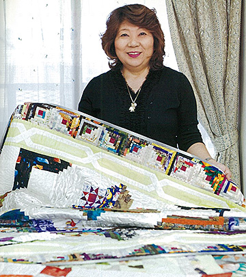 今までに作ったキルトは数えきれないほど。岡本さんが手に持っているのは、ログキャビンとアップリケを組み合わせた初期の頃の作品。