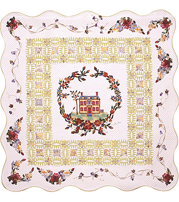 「国際キルト博’98 in JAPAN」出展作品。中心のボルチモアの図案を取り囲むように爽やかな印象の黄緑のダブルウェディングリングを配置。ボーダーには花のブーケをアップリケした、愛と夢がいっぱい詰まった作品。