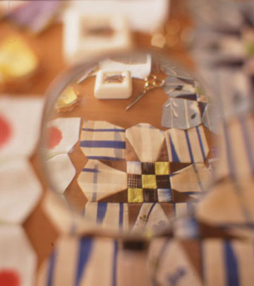 縮小レンズを使って、布柄の配色のバランスを見る。