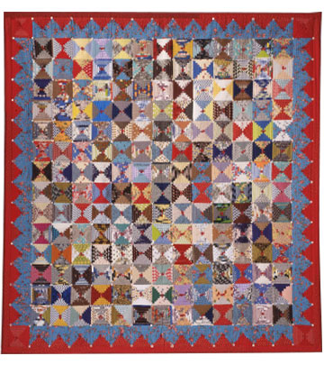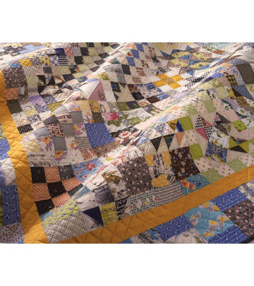 10cmの正方形からはじまり、半分の5cmの正方形、さらに2.5cmの正方形、そして三角形をパズルのように合わせ、大好きな布裂でスクラップキルトにしたもの。単純だけれども好きなキルトの一枚である。