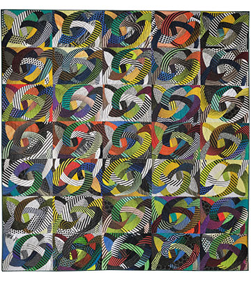 シャープな直線デザインには、どこか日本の着物や手ぬぐいの粋に通じる風通しのよさ、潔さが感じられた。見ようによっては、ポップでモダンでもある。彼女の布を最初の二年間はもっぱら買いためていたが、三年目に使わないと意味がないと思い立ち、ムーブメント(MOVEMENT)のシリーズの第一作が生まれた。それまでハンドで制作していたのが、これを機にミシンに転向することになる。振り返ってみても一作目はミシンキルトの会心の作と、自分でも思っている。