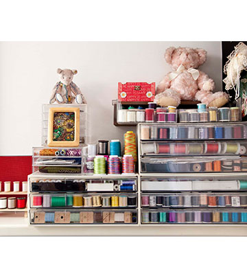 ミシンキルトに欠かせない、さまざまな糸たち。ミシン糸からラメや刺しゅう糸など色・素材共に豊富にそろえている。