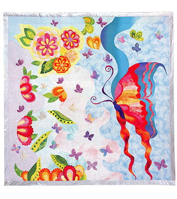 「2007年東京国際キルトフェスティバル」出展作品。春はさまざまな人生が始まる季節。蝶や妖精、花たちが気持ちよさそうに、あちらこちらと飛び回る、そんな様子を鮮やかな色使いで表現している。