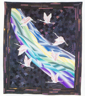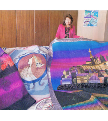 高橋さんのキルトは、コンテンポラリーと称される。いわゆる伝統的なパターンを踏襲したトラディショナルキルトに対して、あらゆる約束事を取り払った、自由な創作キルトである。家業の呉服屋で和布に囲まれて暮らしていると、まったく違うジャンルに飛び込みたいという気持ちが強くなったという。 コンテンポラリーキルトは、題材も自由なら、素材や手法のスタイルも自由である。キルトは伝えたいことを表現するための手段である。歌手は歌で表現し、役者はお芝居で表現する。キルトは、今生きている自分が、どういう想いで生きているか、その表明とも言える。 それが、家族のための記念キルトだったり、旅行の思い出キルトだったりと、人生の時々を表現するキルト。幸せなことにキルトを通して自分を表現し、見た人々に感動も与えることができる。自分の想いを込めたキルトが、こうして人々をつなぐ役割も果たすことを、大切にしているという高橋さんである。 高橋さんの作風は遠近法を駆使した、幻想的でカラフルなものが多い。この世界を保ちながらこれから挑戦してみたいのは、「京都」を主題にした作品を作ることだ。この歴史と伝統の鎧をまとった古都を、自分なりに現代的に表現できないものかと、思いを温めている。 京都に嫁いできて四十年余り、やっと京都という土地柄を理解できたかなという思い半分、まだまだ底知れぬ思い半分。京都の独特の文化の中で新しいもの好き、本物好きの京都人の、感動の「京都」のキルトを見てもらいたいと思う。 「とにかくじっとしていられない性分なので、これからも自分のキルトを生み出すために努力し続けると思います」と、あくまでソフトに語る高橋さんである。 本文より一部抜粋― キルトジャパン2008年5月号より