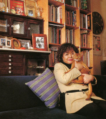 「私は30年、新聞なんか読んでないですよ、とってないんです」。でも情報のキャッチは早く、物事の本質をとらえるのは鋭い。そして新聞を読まなくても本を読むのは大好き。雑学を究めるチャックさんにふさわしく、様々なジャンルの本が書棚に。愛猫プンティーニ嬢と。