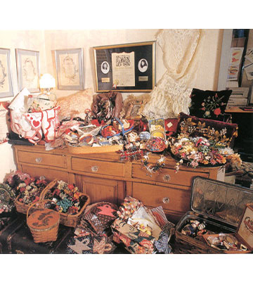 チャックさんのアトリエは、布裂はもとより、アンディークのキルトや布製人形、レースやボタン、毛糸で作った小物たちであふれかえっている。これらのきれいなもの、可愛いもの、変わったもの、面白いもの、心を奮い立たせるものたちを、インスパイア―と呼んでいるが、古い貝ボタンひとつにも、見つけた時の興奮、手に取った時の震えるような喜びが込もっている。