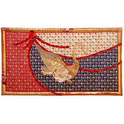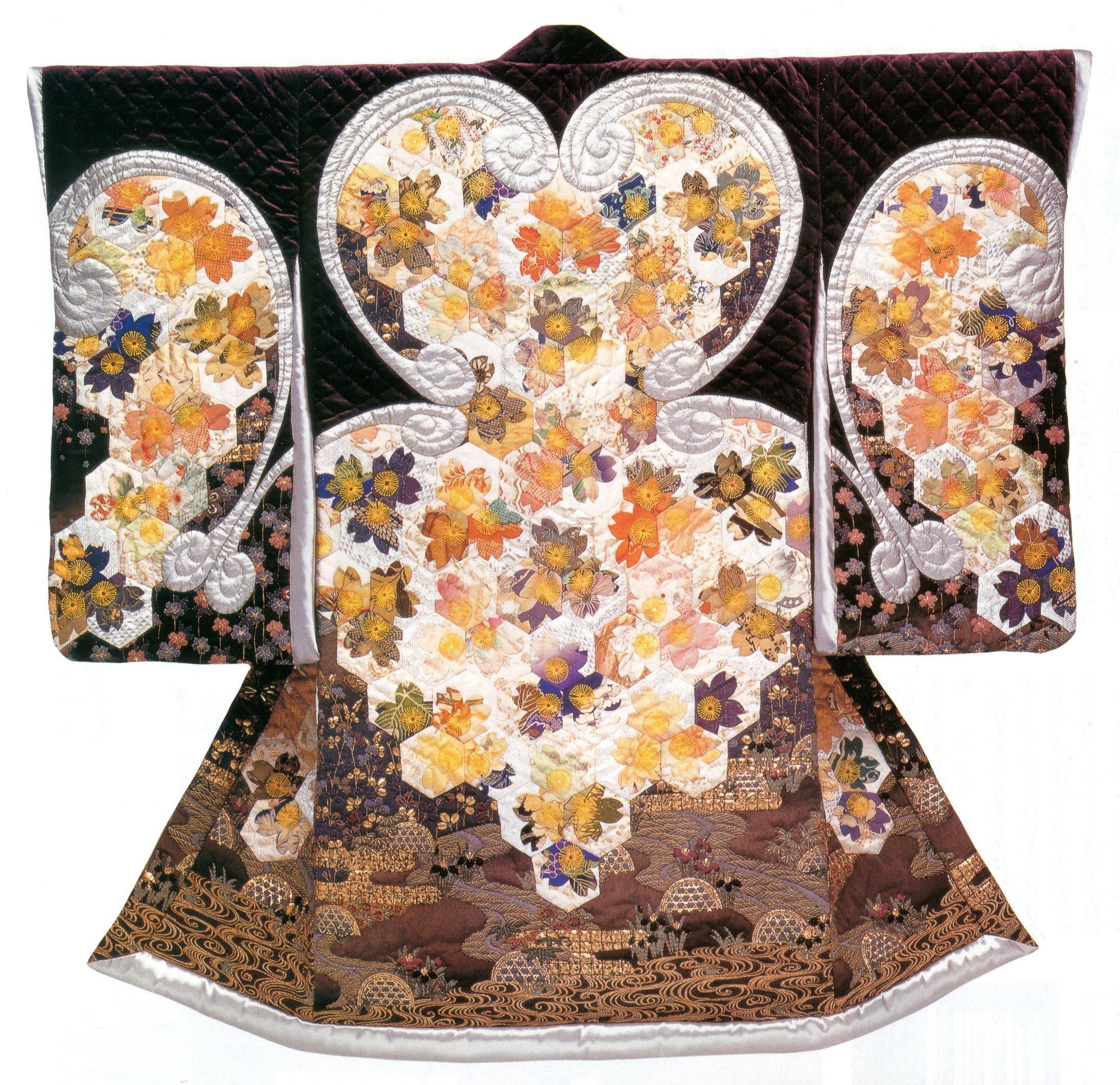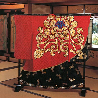 日本の伝統工芸<漆>の美しさをイメージし、金、茜、黒を基本色に構成。大牡丹と唐草はシルクサテンの黒と金襴のヘクサゴンはぎをアップリケし、漆の中に凛と映える螺鈿の様。