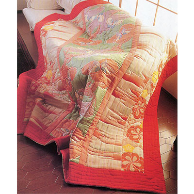 赤系の色合いで、暑い夏をイメージしたキルトは大胆なシンメトリーのデザイン。長襦袢や羽織などの着物からリメイクし、梅柄の着物地を使用。林家では、ベッドカバーやソファー掛けにしたりと、部屋のインテリアにもなっている。