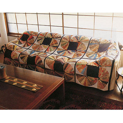 扇子のリバーシブルキルト。前面は扇子、後面はログキャビンのパターンが使われている。扇子の部分はほとんどが着物地、その周りは白のコットン、ブロックとブロックの間は黒のグログラン・リボンで区切ってある。夏用のベッドカバーとして作られたものだ。