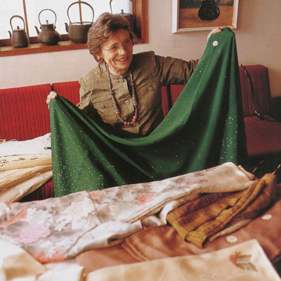 アメリーさんは生粋のフランス人。アメリーさんは戦争中に幼少期を送り、着るものも配給切符で支給された時代、それもほとんど姉のお下がりで過ごした。それでも、十二歳の頃から廃物直前の古い洋服を利用しては、スカートやブラウスを縫っていたという。そしていつか、プリンセスのためのドレスを縫いたいと夢見ていた。のちにクリスチャン・ディオールのアトリエで働くようになって、マーガレット王女のドレスを縫い、それが実現した時に一番驚いたのは自分だった、とアメリーさん。(中略)着物はパリでも、ファッションショーを見に来る艶やかな日本女性の姿を見ていた。でも初めて来日した時に、赤ちゃんを負ぶった和服の女性が街を歩いているのを見て、ああ、本当に日本人は着物で生活しているんだと感慨があったという。着物地の布を最大限生かそうとする時に最適なデザインの一つが、パキスタンのパンジャビスーツだという。深いサイドスリットが入った着物地の長めのパンツスーツは、エレガントさと着易さを兼ね備えていて、とても重宝するとアメリーさんのお気に入りである。古着物の魅力は、まず生地の紋様と手触りだった。今までオートクチュールでたくさんの高級シルクを扱ってきたが、日本の着物は独特だった。着物の奥に、多分今は亡き織った人、染めた人、刺しゅうした人などたくさんの作り手たちの姿が隠れており、そのミステリアスな部分にも惹かれた。「ヨーロッパの洋服はフォルムが大事とされます。そこで色とのアンサンブルで見せようとしますが、日本の着物は形が決まっているので、紋様が重要となりますね。私が美しいと感じた紋様はパッチワークの作品でも細かく切らないで、それを活かすことを考えます」
